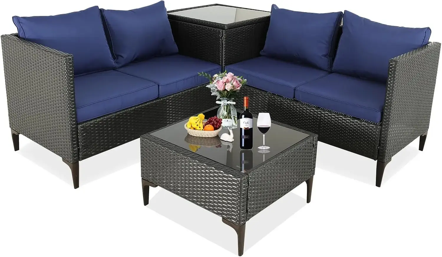 Patio furniture 4 piece set coffee table is equipped with black tempered glass top and suction cup, making the outdoor conversation set more beautiful and sturdy.