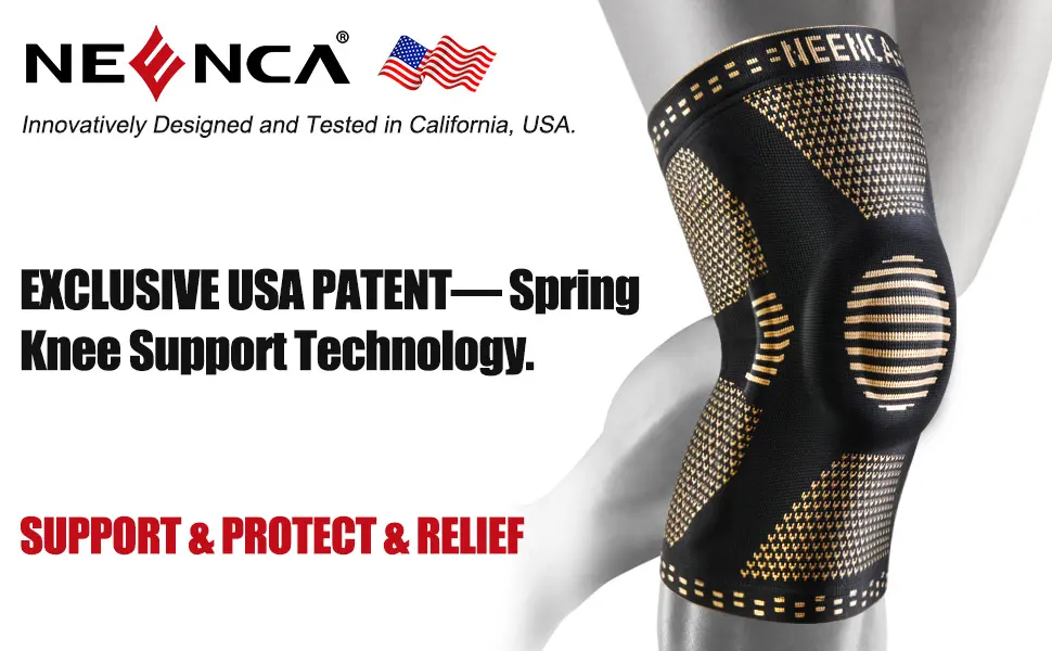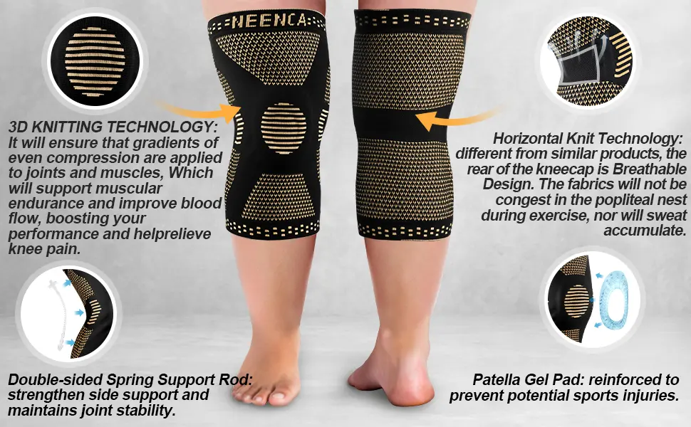 EXCLUSIVE PATENT— NEENCA Copper Ions Infused Technology: Real 60% Copper Ions Infused Fiber + 21% Nylon +16% Polyester. Spring knee support technology: An anatomically contoured patella gel pad surrounds the kneecap, dual metal spring stabilizers fit tightly with your knee joint. These special functional elements strengthen side support and maintain joint stability. It effectively disperses pressure, keeping knee warm, lubricating your joints. BEST CHOICE for sports protection and pain recovery.