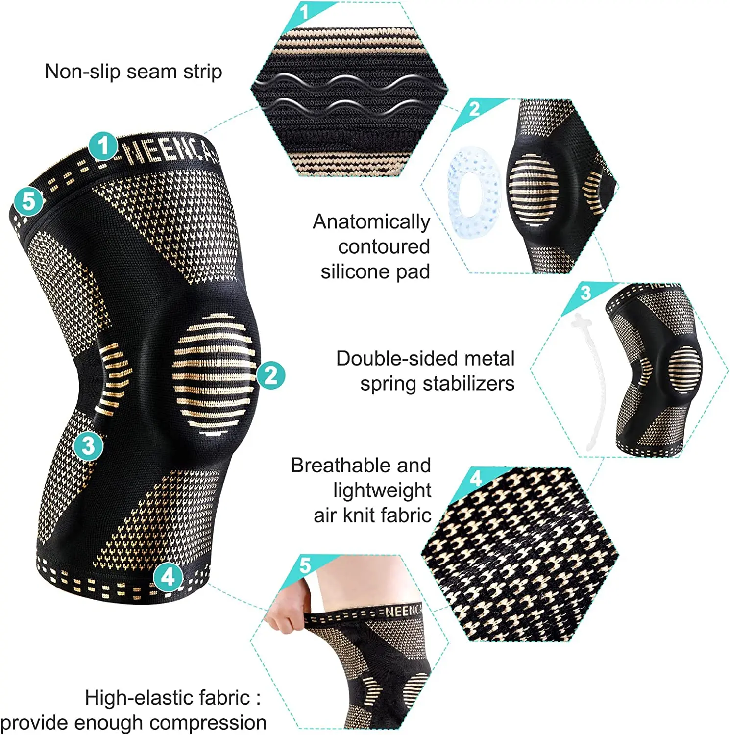 EXCLUSIVE PATENT— NEENCA Copper Ions Infused Technology: Real 60% Copper Ions Infused Fiber + 21% Nylon +16% Polyester. Spring knee support technology: An anatomically contoured patella gel pad surrounds the kneecap, dual metal spring stabilizers fit tightly with your knee joint. These special functional elements strengthen side support and maintain joint stability. It effectively disperses pressure, keeping knee warm, lubricating your joints. BEST CHOICE for sports protection and pain recovery.