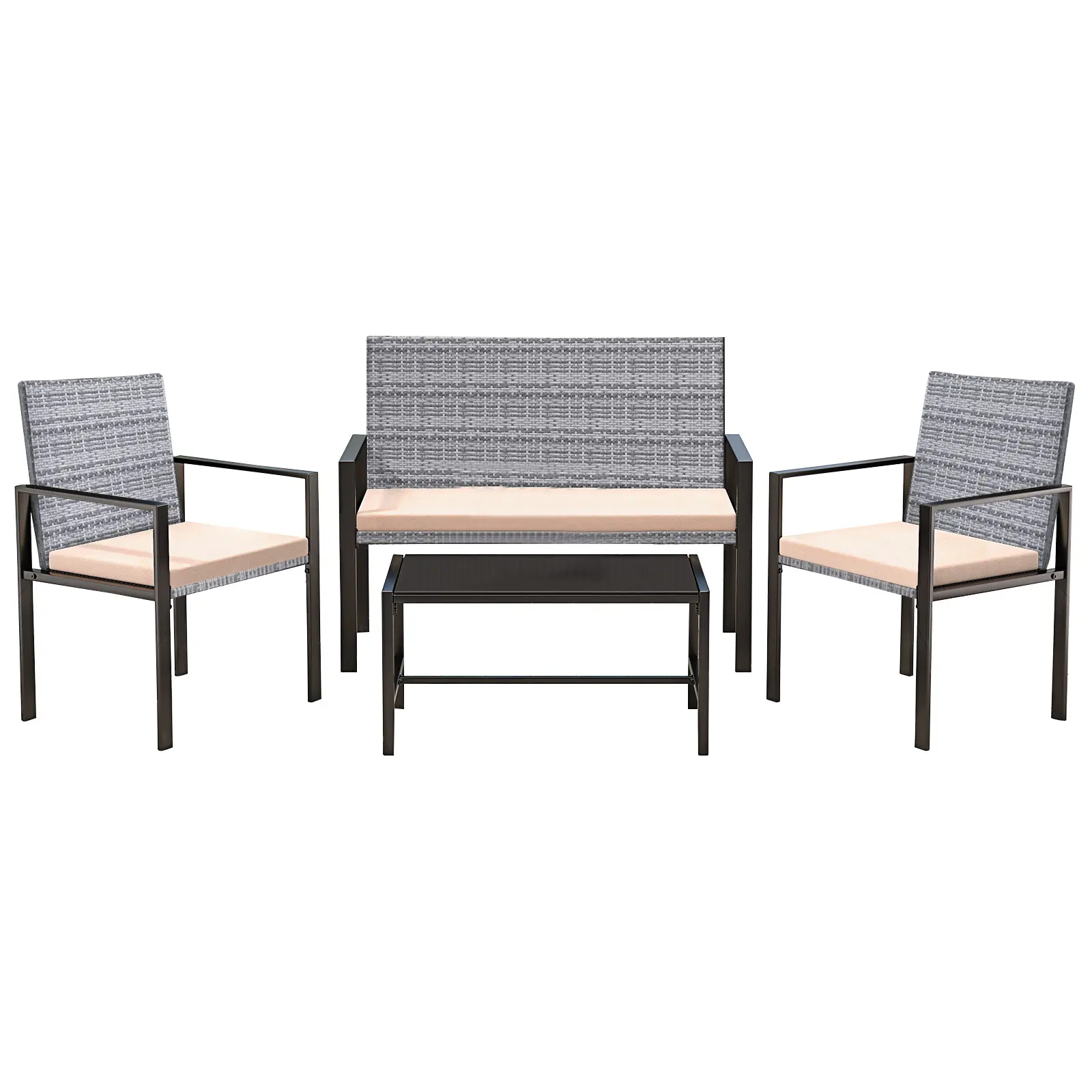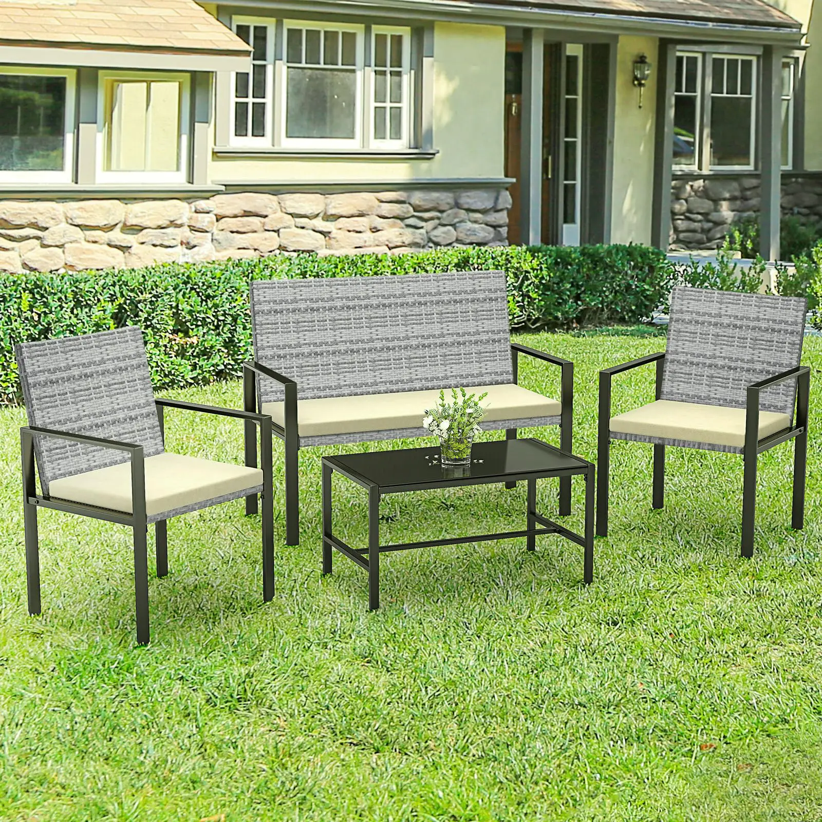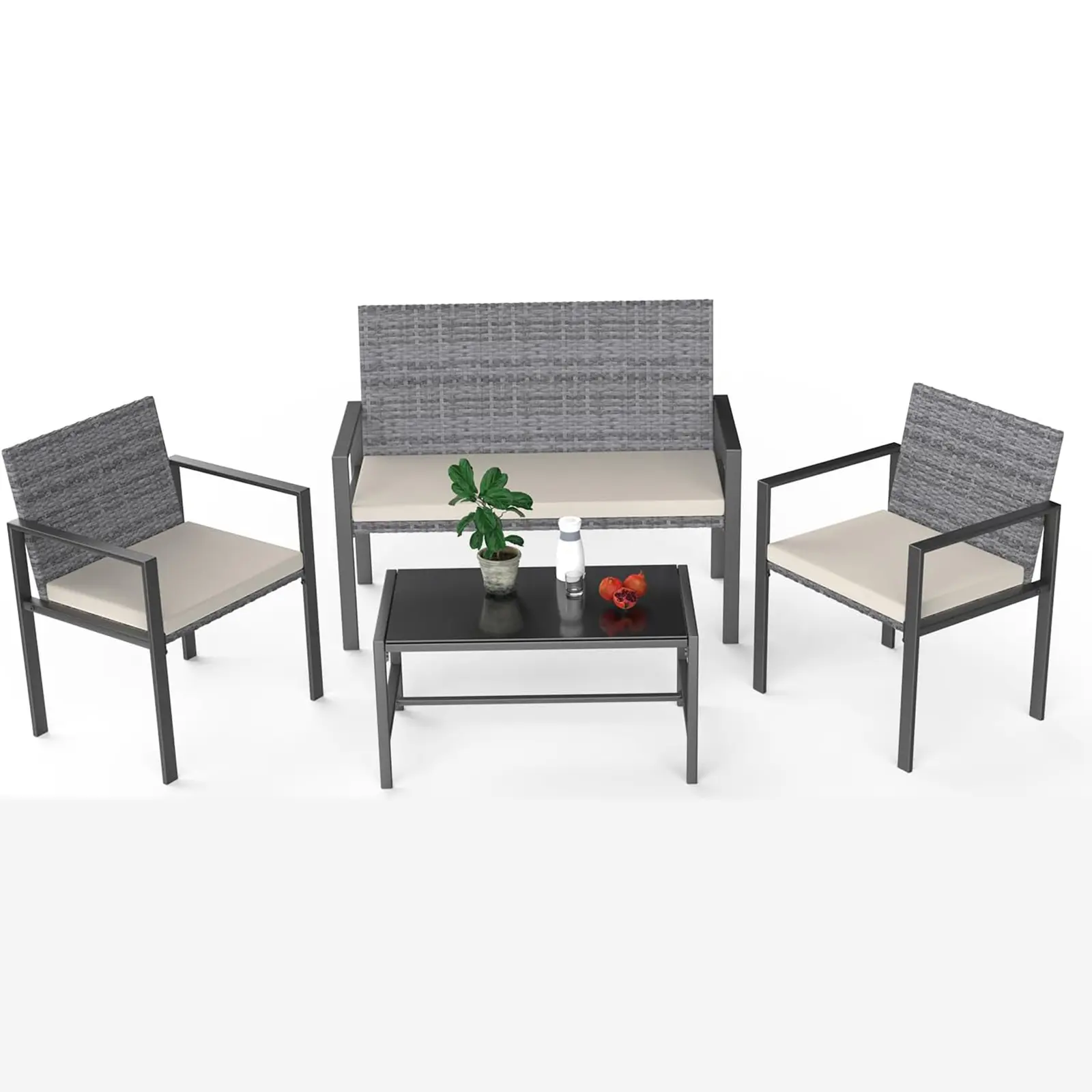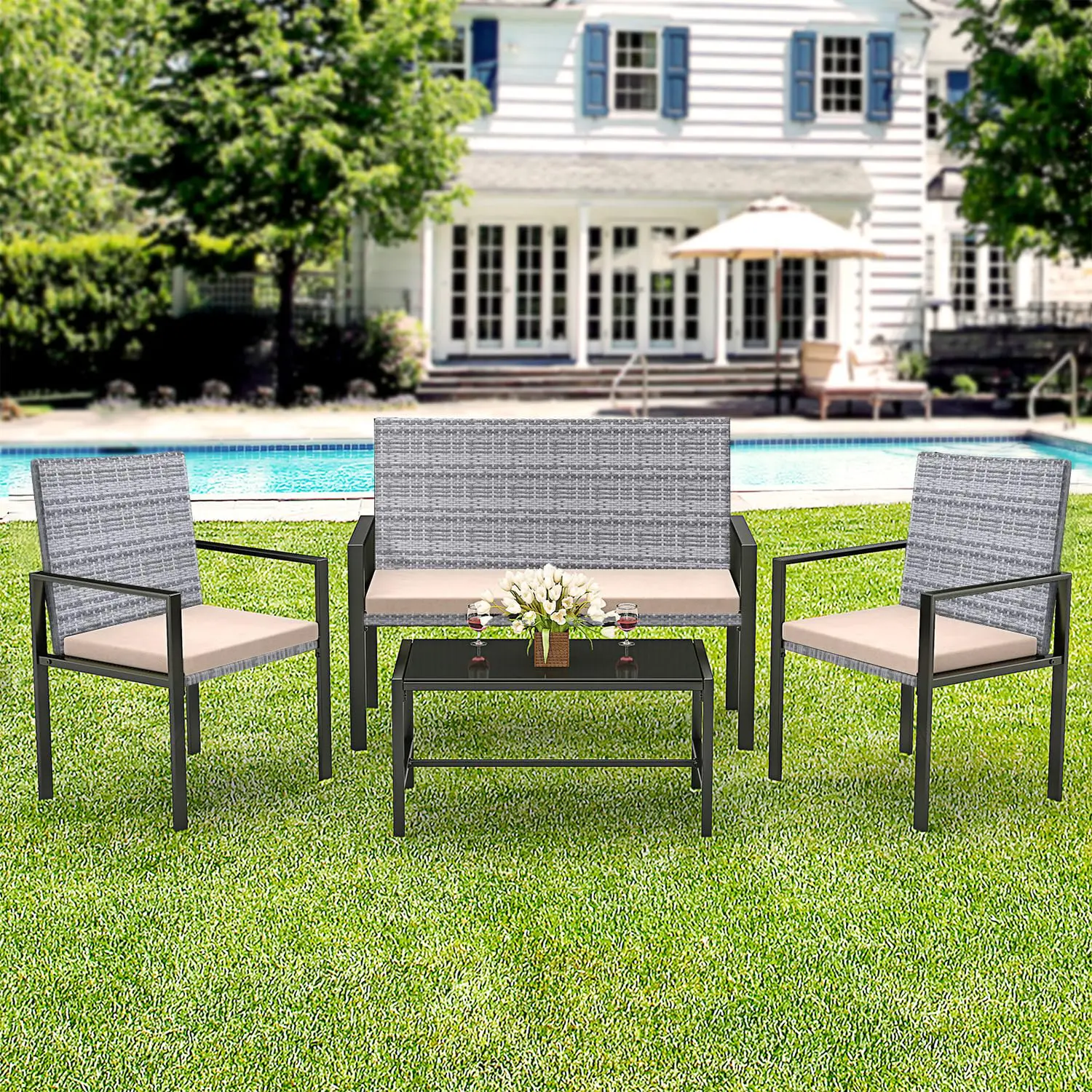 bigzzia Garden Furniture Set Outdoor Corner Sofa Couch, 4pcs Handwoven Rattan Patio Conversation Set, Cushions and Glass Table