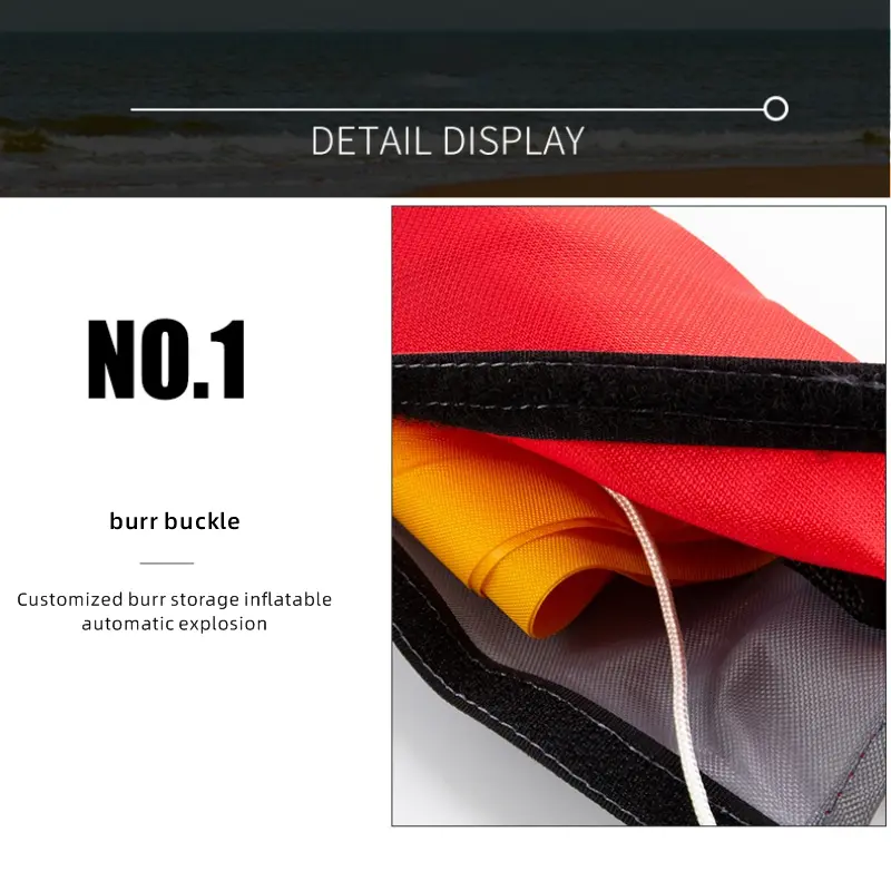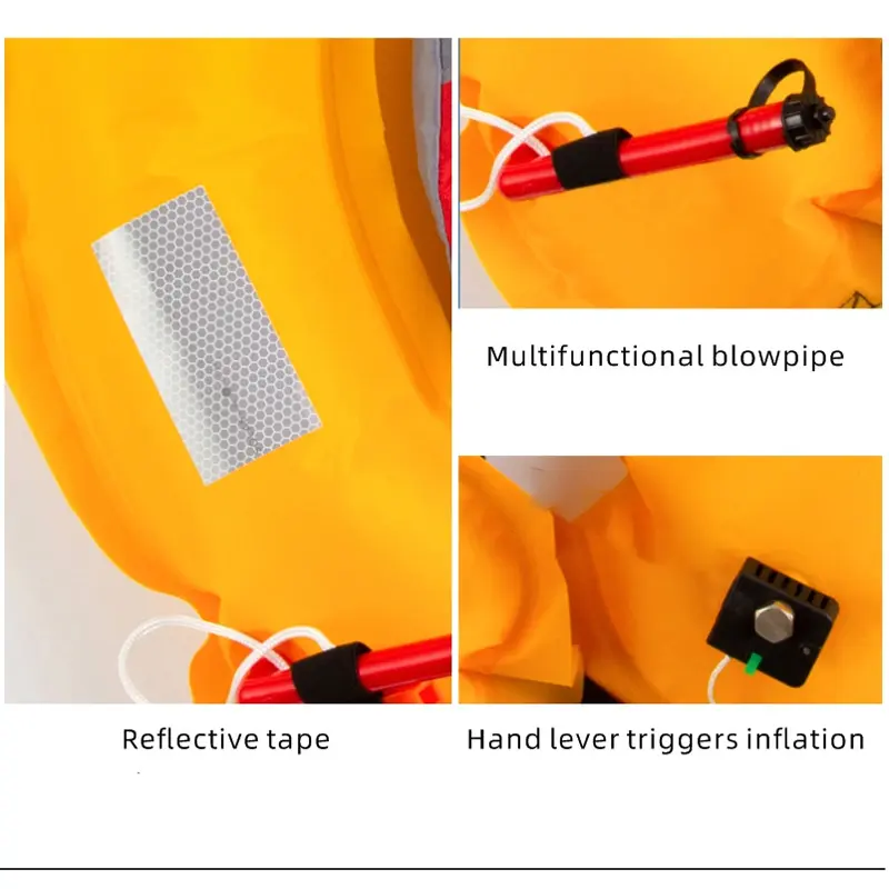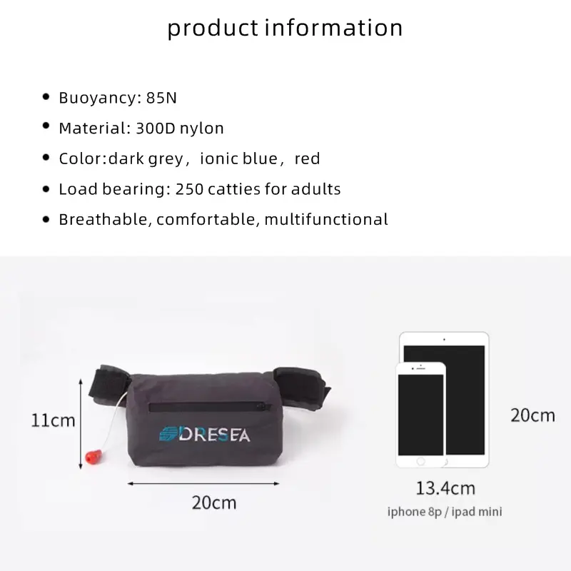 2. Zipper pocket for convenient storage of keys, waterproof camera, etc. Quadrate air bag tightly surrounds your body under your arms after inflated.