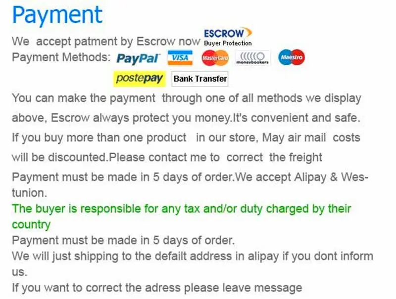 Customs fees are not handled by us so please be aware that when you consent to packages being delivered you may incur custom fees when they arrive.