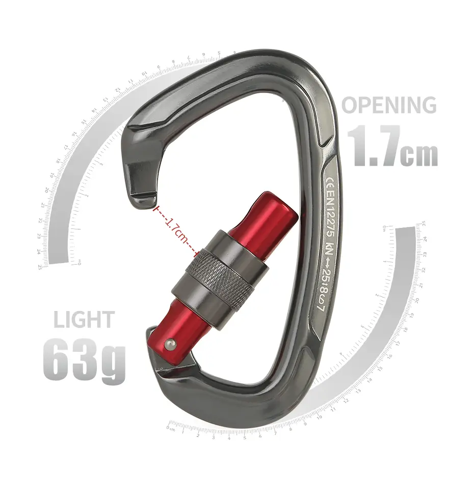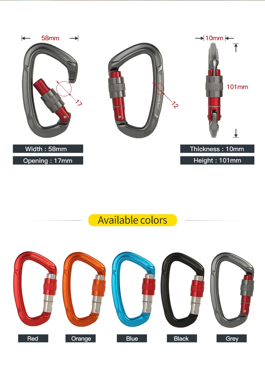 Specifications: Material: Strong aluminum alloy Weight: 63g Breaking Strength: 25kN Vertical, 8kN Horizontal, 7kN open gate Dimensions: Width 58mm, Height 101mm, Thickness 10mm, Opening 17mm Color Options: Red, Orange, Blue, Black, Grey Multipurpose Use: Climbing, expanding, fire fighting, working at height, caving, hanging Features: |Black Diamond Rocklock Screwgate Carabiner| **Unmatched Durability and Strength** The Outdoor Professional Rock Climbing Carabiner is a testament to robust engineering and uncompromising safety. Crafted from a high-grade aluminum alloy, this carabiner boasts a remarkable breaking strength of 25kN vertical, 8kN horizontal, and 7kN open gate, ensuring that it can withstand the rigors of the most demanding climbing conditions. Its lightweight design at just 63g makes it an ideal choice for climbers who value both performance and portability. **Versatile and Reliable** Designed for versatility, this carabiner is not just limited to rock climbing. Its multi-functional capabilities make it suitable for a wide range of activities, including fire fighting, working at height, caving, and hanging. Its sleek D-shape design and smooth screwgate mechanism provide a secure and easy-to-use locking system, ensuring that your gear stays securely attached. The carabiner's vibrant color options, including red, orange, blue, black, and grey, make it easy to identify and distinguish from other equipment. **Designed for the Adventurous Spirit** Whether you're a seasoned climber or a beginner, the Outdoor Professional Rock Climbing Carabiner is an essential piece of climbing technology. Its roll n lock feature enhances its functionality, allowing for quick and easy adjustments. The carabiner's compatibility with various climbing scenarios, from the best places to rock climb in the US to the challenging terrains of caving, makes it a reliable companion for any adventure. Its robust construction and thoughtful design make it a must-have for anyone looking to improve their rock climbing experience.