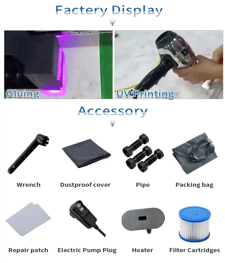 Material: 5cm brushed material Capacity: Suitable for 2-6 people Size: Customized to fit your space Design Style: Modern, sleek aesthetics Massage Type: Powerful massage jets for a relaxing soak MOQ: 1 piece **Rejuvenating Relaxation in Your Own Backyard** Imagine a tranquil retreat in the comfort of your own home or garden, where the stress of the day melts away and you're surrounded by the soothing bubbles of a Hot Tub Bathtub. This spacious and versatile 208*65CM dropstitch spa hot tub is designed to cater to the needs of individuals, couples, or small groups, making it an ideal addition to any outdoor or indoor space. Its modern design and brushed material not only provide a luxurious feel but also ensure durability and easy maintenance. **Customized Comfort for Every Occasion** Whether you're hosting a small gathering or enjoying a quiet evening alone, this spa hot tub can accommodate your needs. With its customizable size, you can create the perfect fit for your patio, deck, or even indoors. Its capacity to hold up to 6 people allows for a social hot tub experience or a romantic getaway. The powerful massage jets are strategically placed to target specific muscle groups, delivering a therapeutic massage that aids in pain relief, rehabilitation, and relaxation. **Spa-Quality Experience at Home** The DWF inflatable hot tub is not just an ordinary bathtub; it's a gateway to a spa-quality experience in the comfort of your home. With its semi-automatic production process, you can expect a high-quality product that is ready for use within a week. The hot tub's ability to improve circulation, ease tension, and promote better sleep is backed by scientific studies, making it a smart investment in your well-being. Whether you're looking to unwind after a long day or seeking a solution for insomnia, this hot tub is designed to deliver the ultimate relaxation.