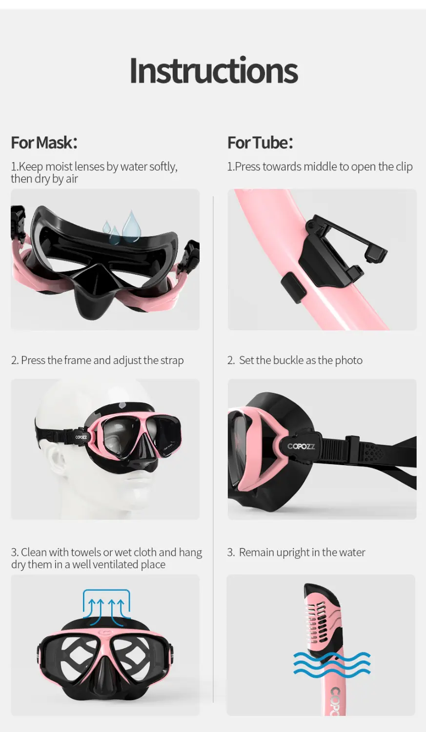 Quick release snorkel buckle easily attached to the mask. Flexible tube with soft silicone mouthpiece ergonomically designed for a proper fit, advanced comfortable mouthpiece helps minimize jaw fatigue. Best snorkeling experience ever.