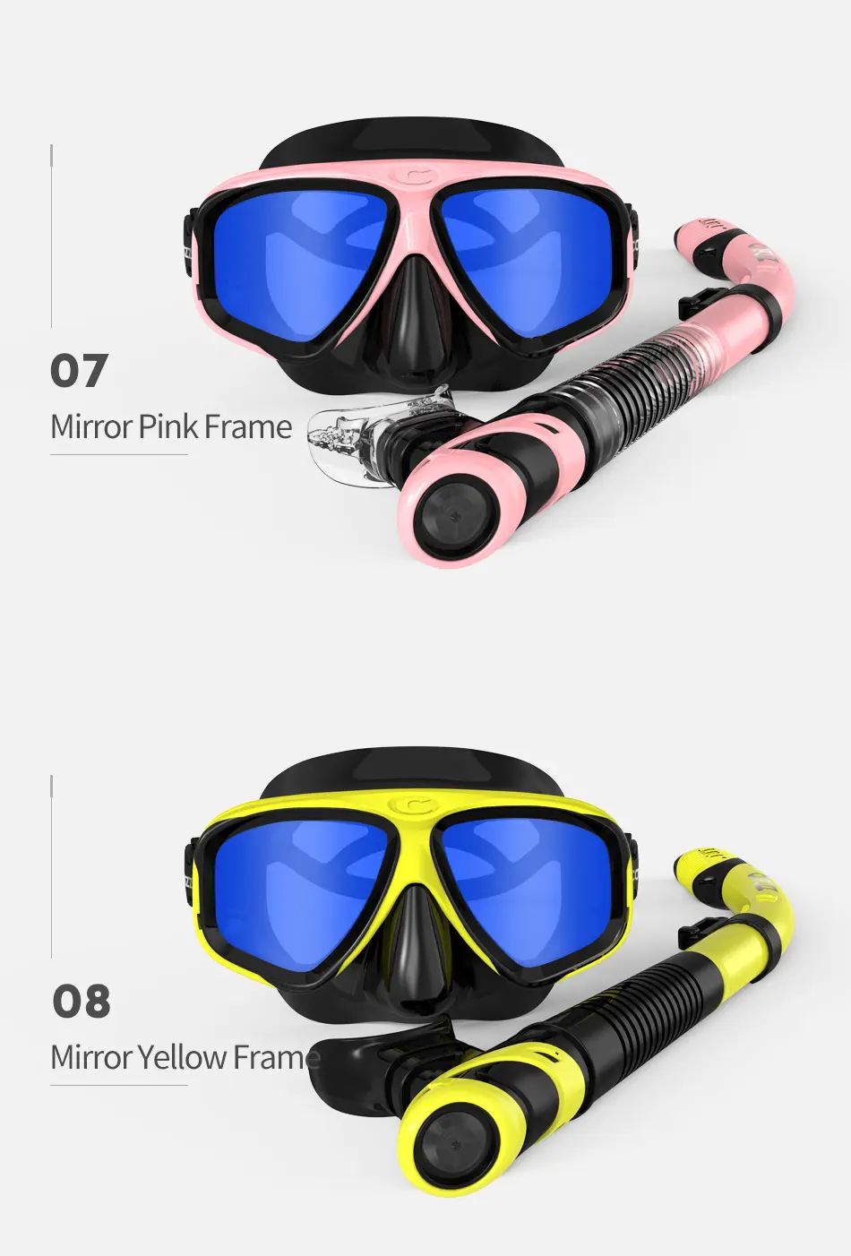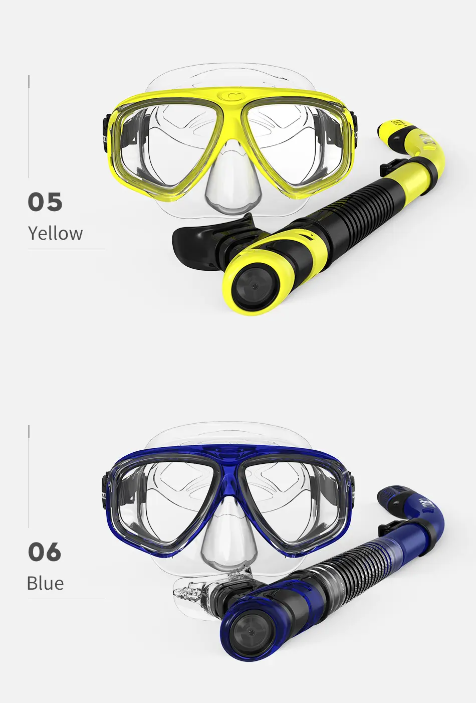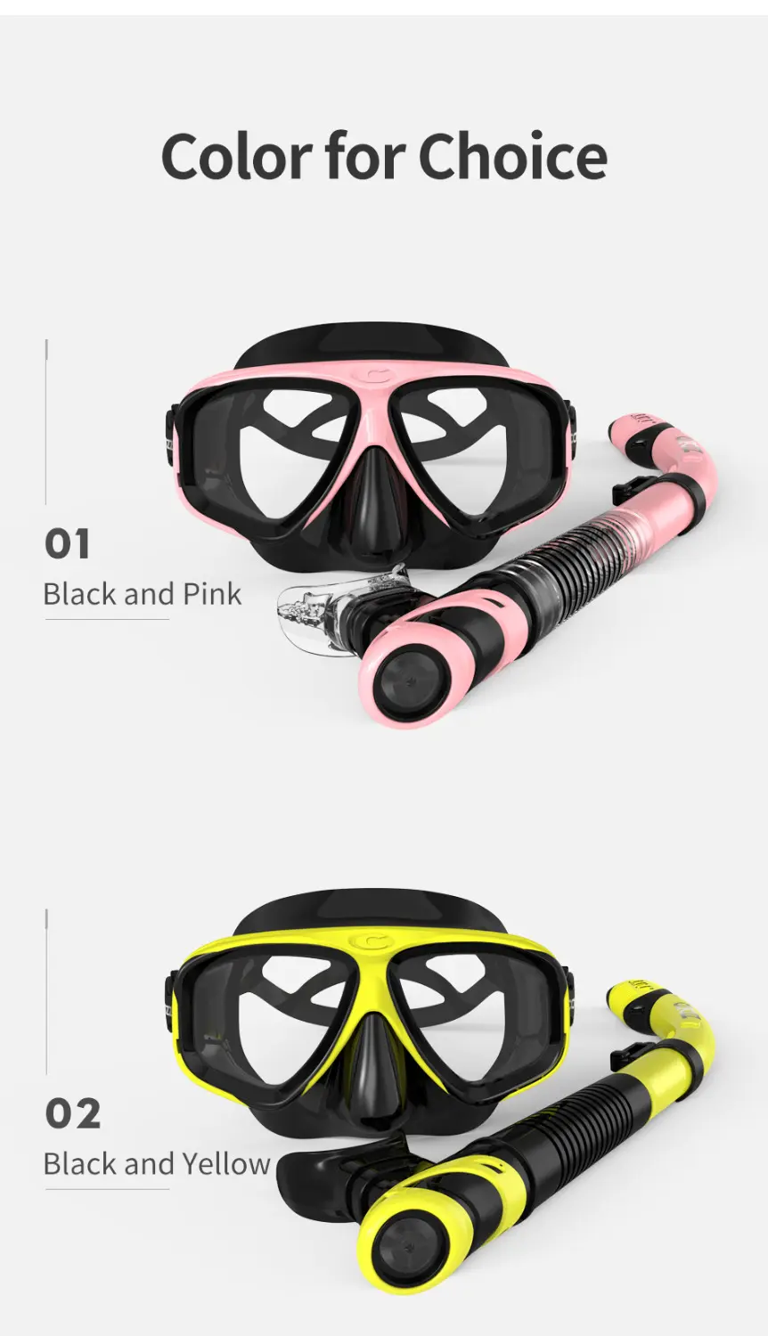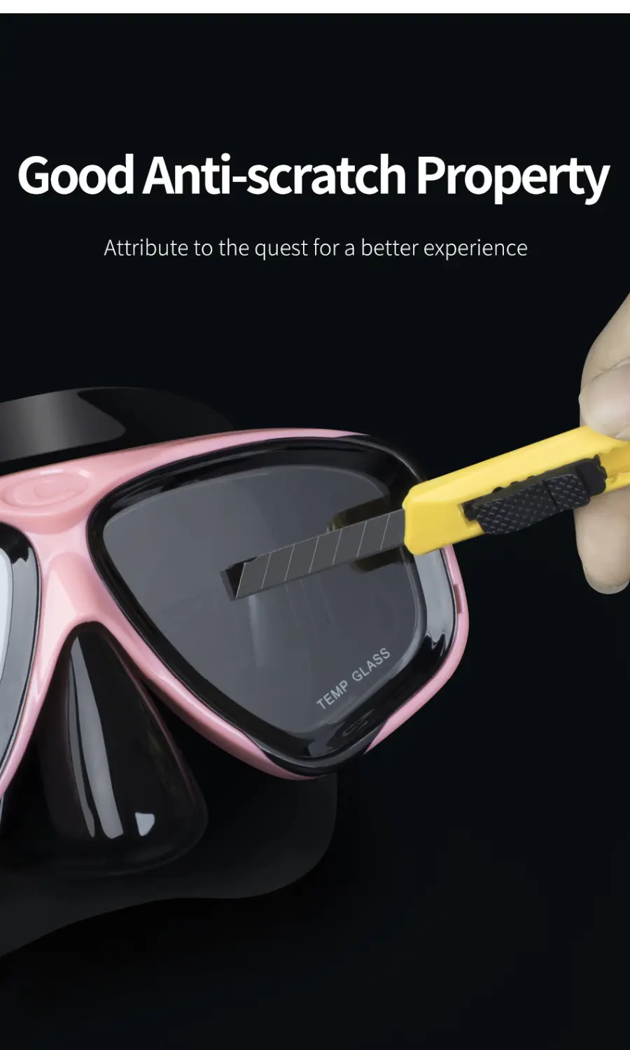 Snorkel mask with shatter-resistant glass lenses to withstand deep water pressure. Scratching resist lens instead of polycarbonate enables you a clearer view under water.