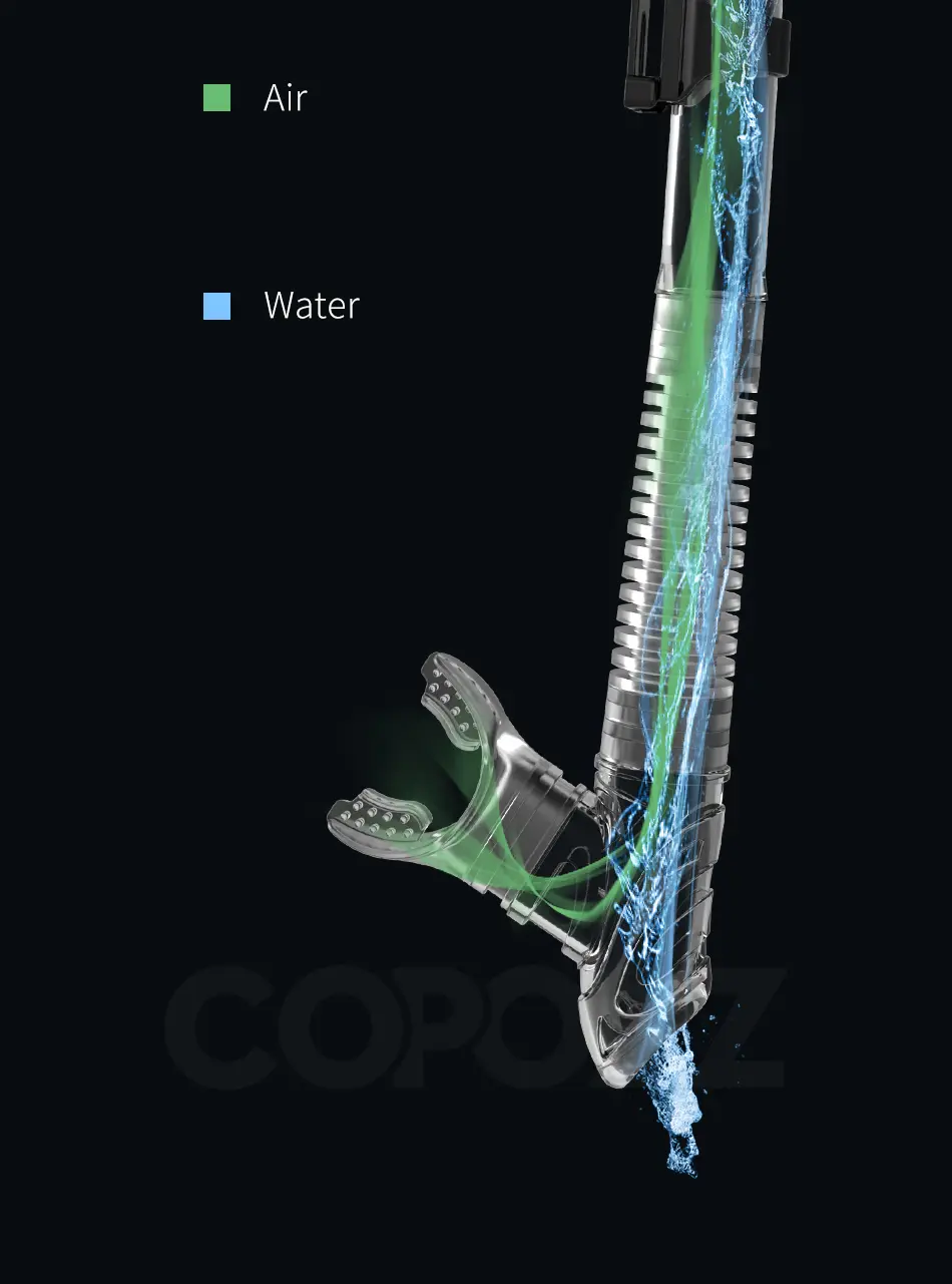 When you dive into water the top valve seals the tube automatically. So no water gets into the snorkel tube and cause any choke, no salt water and panic feelings. Bottom valve also helps to prevents water comes from below and for cleaning. Easy breathing during lap swimming.