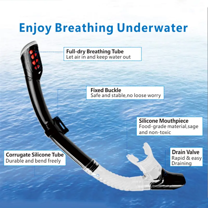 The top valve has a float valve. When the tube head is submerged in water, the float will immediately start the valve to seal the breathing tube and prevent water from being scooped.