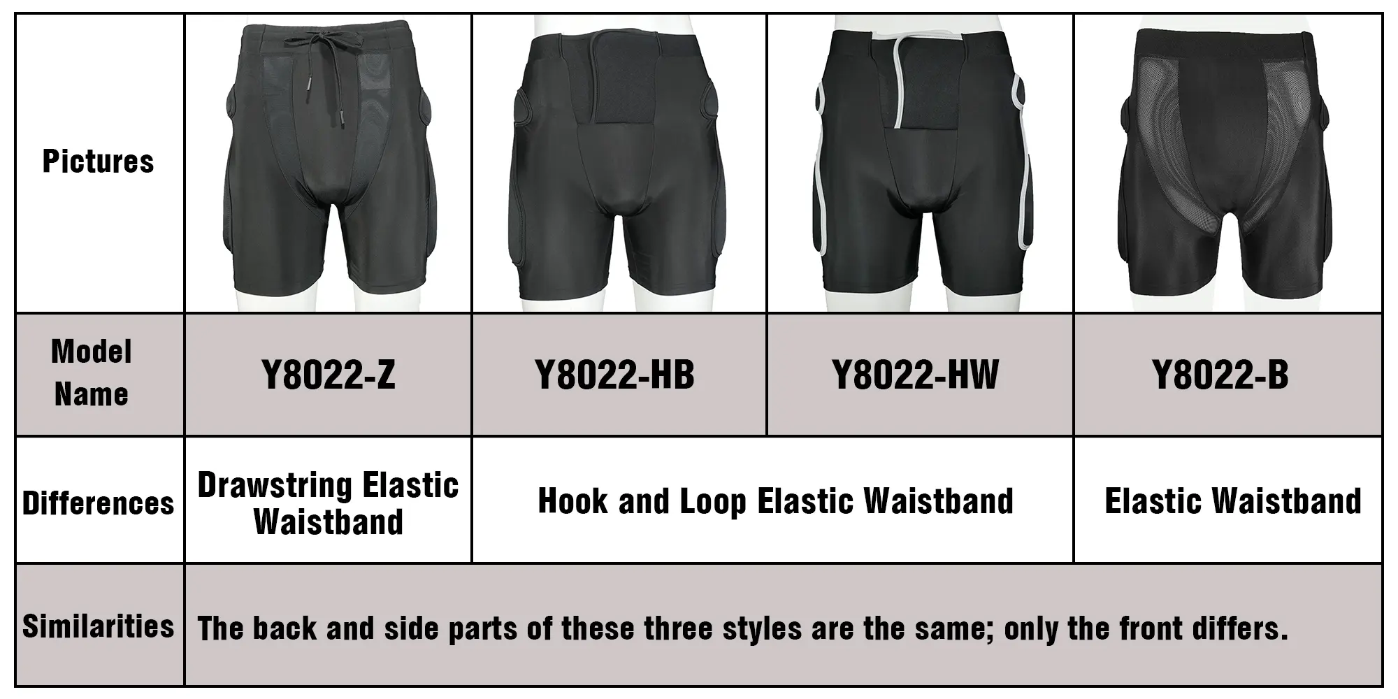 The following image shows the Y8022-D shorts. A key feature of these shorts is the hook-and-loop (velcro) waistband, which makes them easy to put on and take off. However, compared to the Y8022-D model with a drawstring waistband, this version is less adjustable and may not fit as loosely.