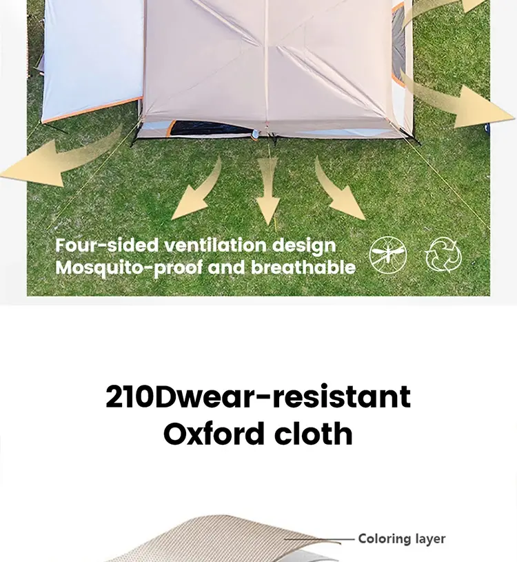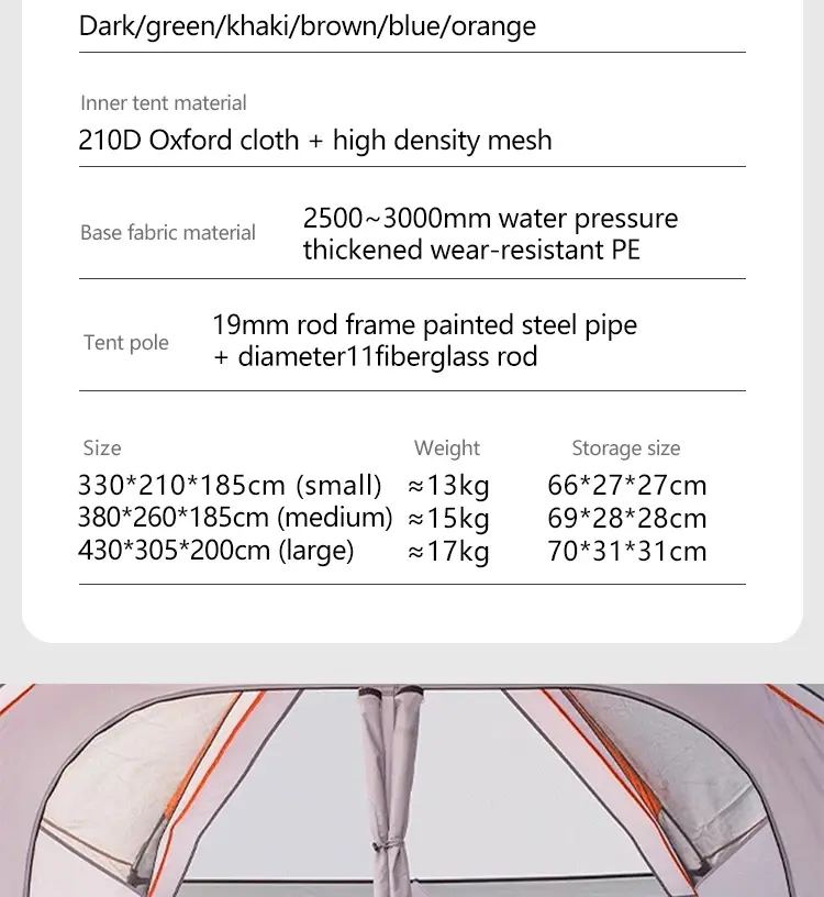 Internal tent material: 210T water pressure encrypted Oxford cloth 4500MM