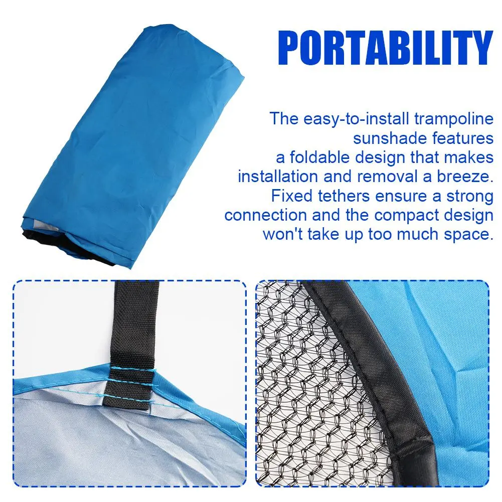 PORTABILITY: The easy-to-install trampoline sunshade features a foldable design that makes installation and removal a breeze. Fixed tethers ensure a strong connection and the compact design won’t take up too much space.