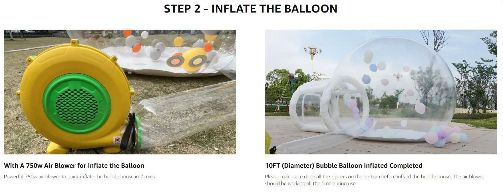 🎈 [ COMMERCIAL GRADE ] Our inflatable bubble house is commercial grade, designed to sustain the wear and tear of events, and manufactured with the highest standards. Very suitable for indoor party or outdoor activities .