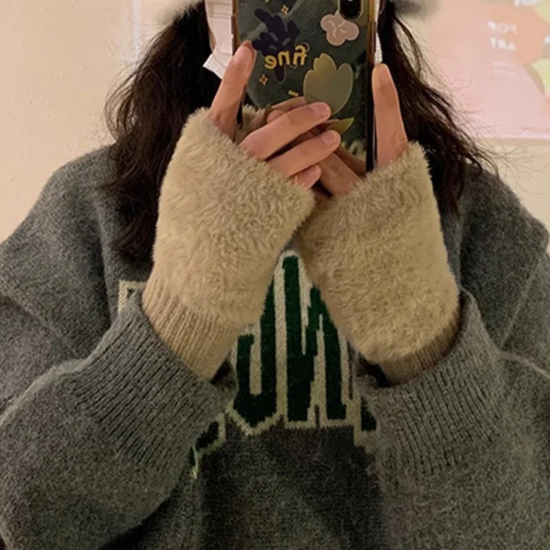 Mink Fleece Soft Winter Half Finger Gloves Women Warm Luxury Solid White Plush Knitted Fingerless Gloves Wrist Mittens Writting