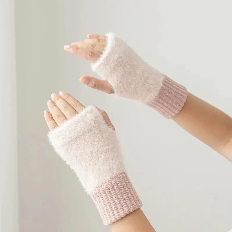 Mink Fleece Soft Winter Half Finger Gloves Women Warm Luxury Solid White Plush Knitted Fingerless Gloves Wrist Mittens Writting