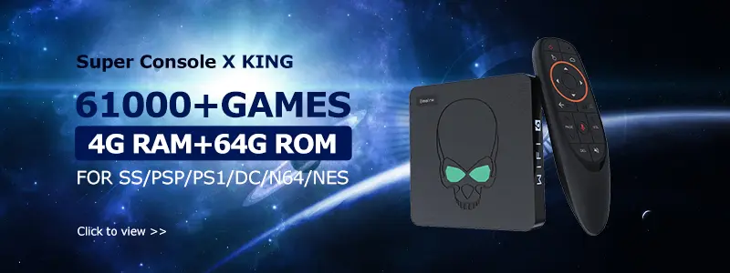 Super Console X King is the latest video game console in the Super Console X series. It integrates EmuELEC 4.3, Android TV 9.0 and CoreELEC. The video game console has built-in 61000 classic retro games, compatible with PSP/PS1/N64/DC/NDS/SS