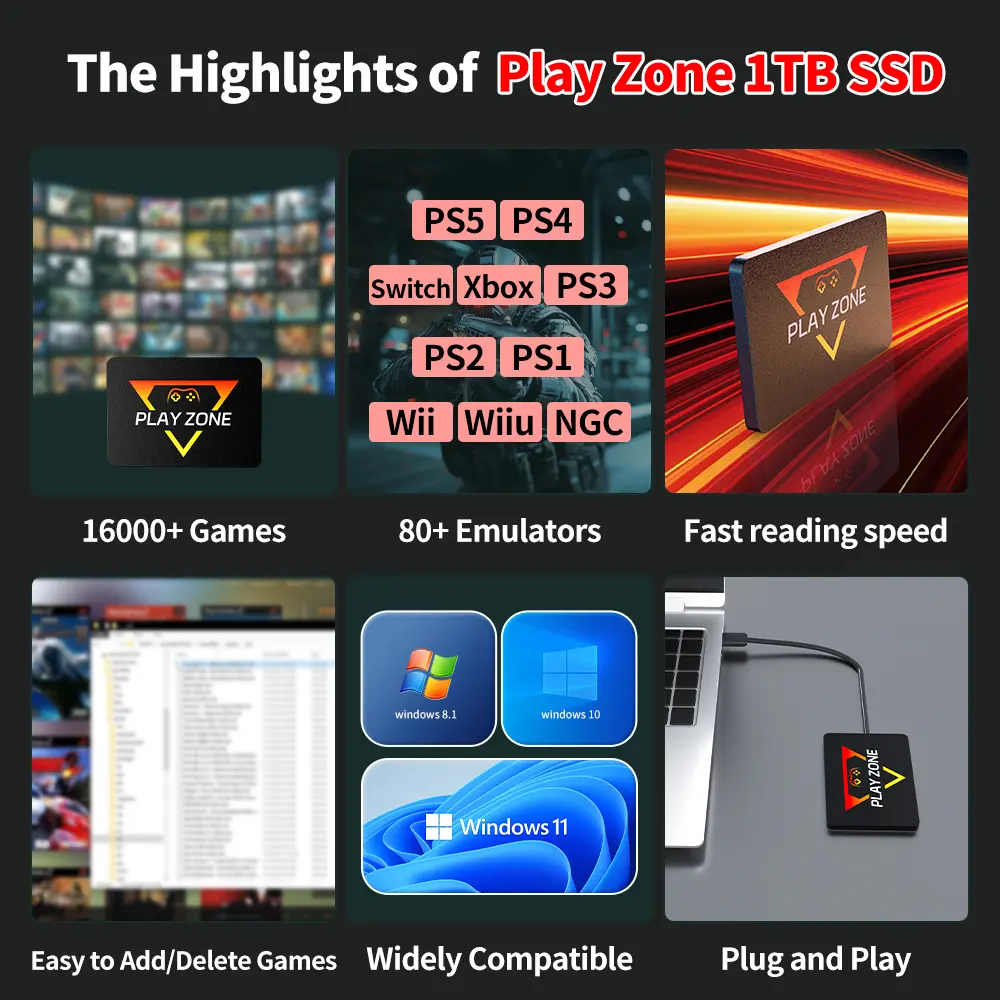 This 1TB Gaming SSD pre-installed 80+ emulators, perfectly run for PS5, PS4, Switch, XBOX, PS3, PS2, PS1, Wii, Wiiu, NGC etc
