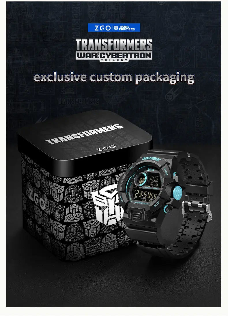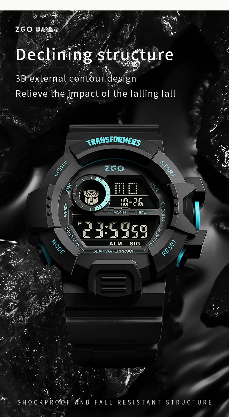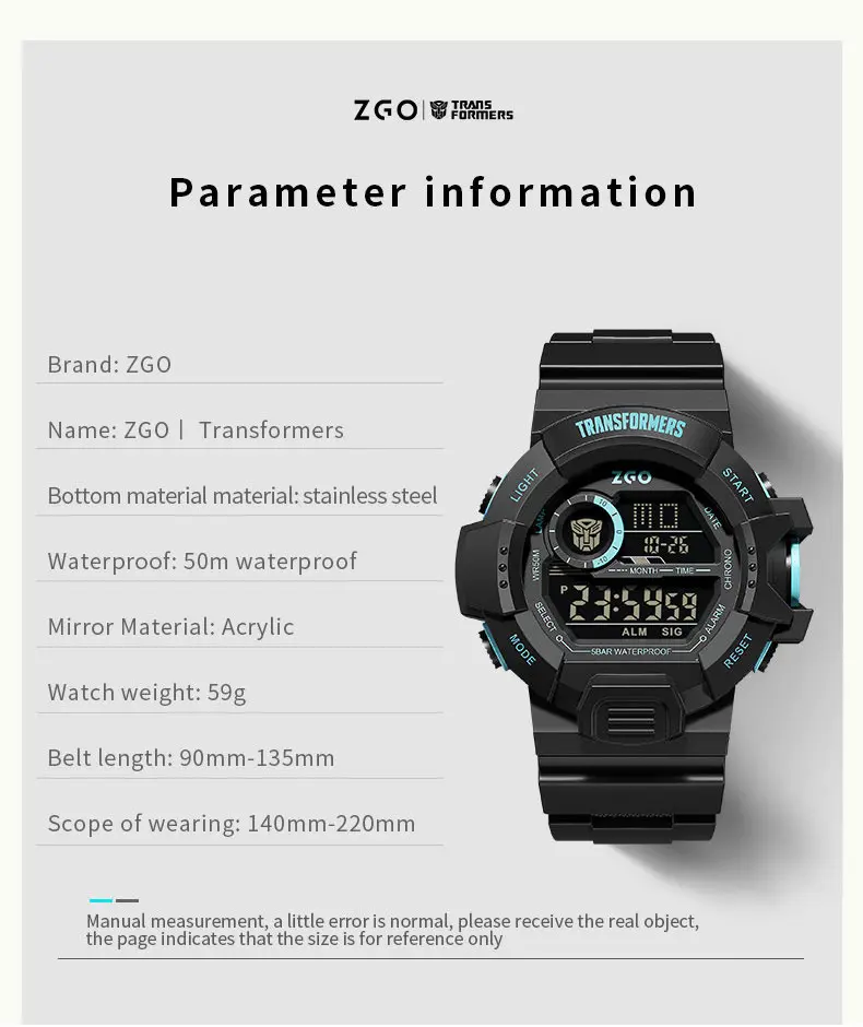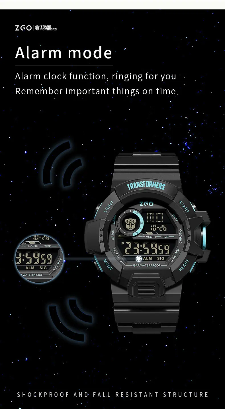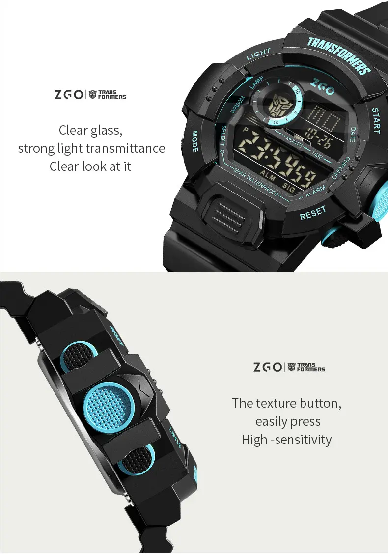 Specifications: Material: Durable rubber strap and organic glass mirror Design and Style: Sporty round shape with large dial for easy reading Waterproof Depth: 5ATM, suitable for swimming and water activities Additional Functions: Luminous alarm clock, 24-hour indication, week and month display Display Mode: Digital with clear LED lights Inclusions: Watch, instructions, and a free Iron box (valued at 1USD) Features: Children's Watches **Durable and Stylish Design** The ZGO X Transformers Children's Watch is a perfect blend of durability and style, designed to withstand the rigors of an active lifestyle. The sporty round shape and large dial make it easy for kids to read the time, while the robust rubber strap ensures a comfortable fit for all-day wear. The watch's organic glass mirror is not only scratch-resistant but also provides a clear view of the digital display, which features a luminous alarm clock and 24-hour indication for precise timekeeping. **Versatile and Functional** This digital wristwatch is not just about style; it's also a practical accessory for children. The 5ATM waterproof depth makes it suitable for swimming and other water-related activities, ensuring that kids can enjoy their favorite sports without worrying about damaging their watch. The watch also includes a week and month display, making it a helpful tool for teaching children about time management and scheduling. With its easy-to-use interface, this watch is perfect for both boys and girls who are always on the go. **A Gift That Keeps Giving** The ZGO X Transformers Children's Watch is an ideal Christmas gift for kids who love both style and functionality. Not only does it come with a watch, instructions, and a free Iron box, but it also serves as a tool for teaching responsibility and time management. The watch's sporty design and waterproof capabilities make it a versatile accessory that can be worn during school, sports, or playtime. With its large dial and easy-to-read digital display, it's a watch that kids will love to wear and parents will love to gift.