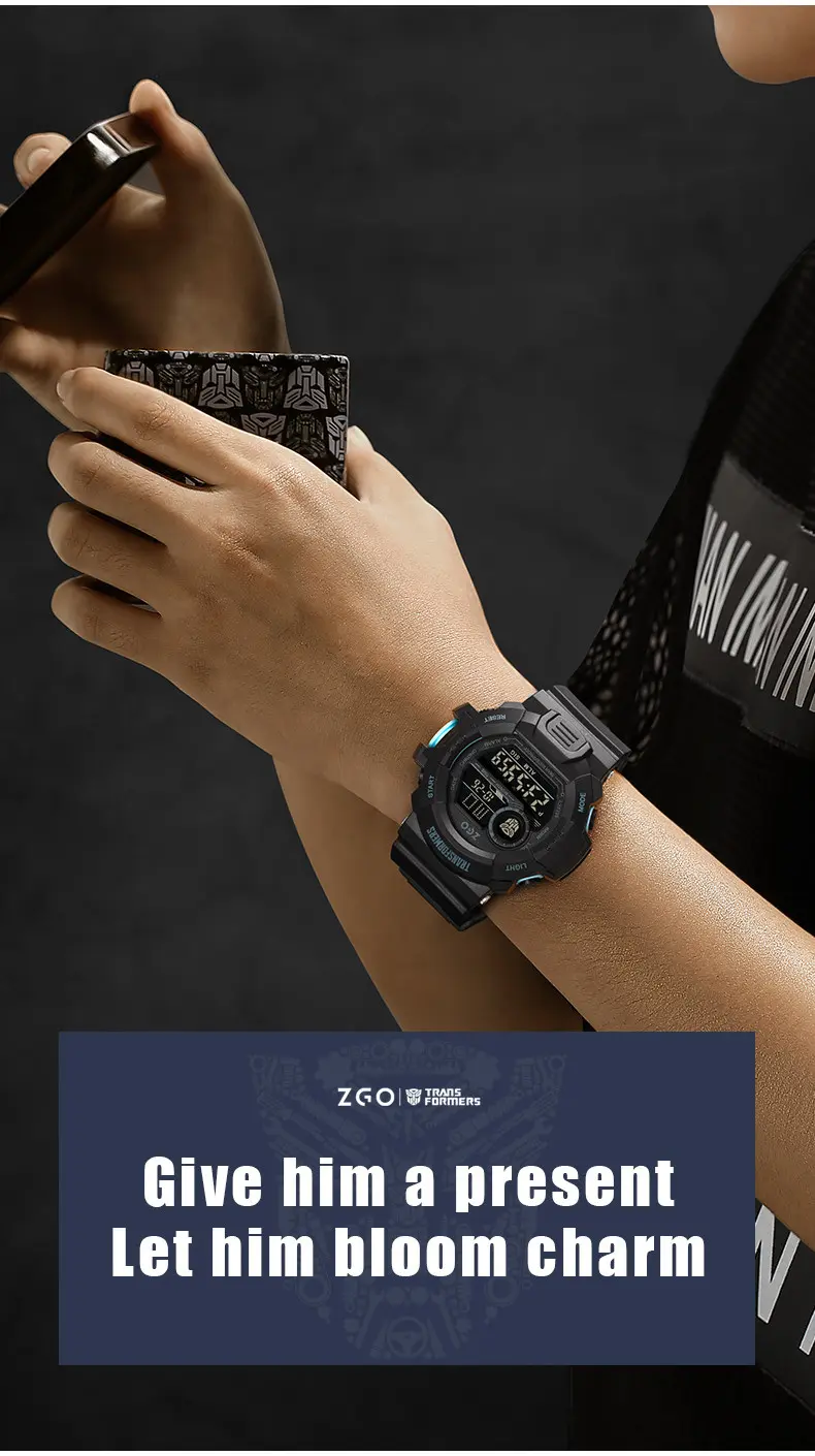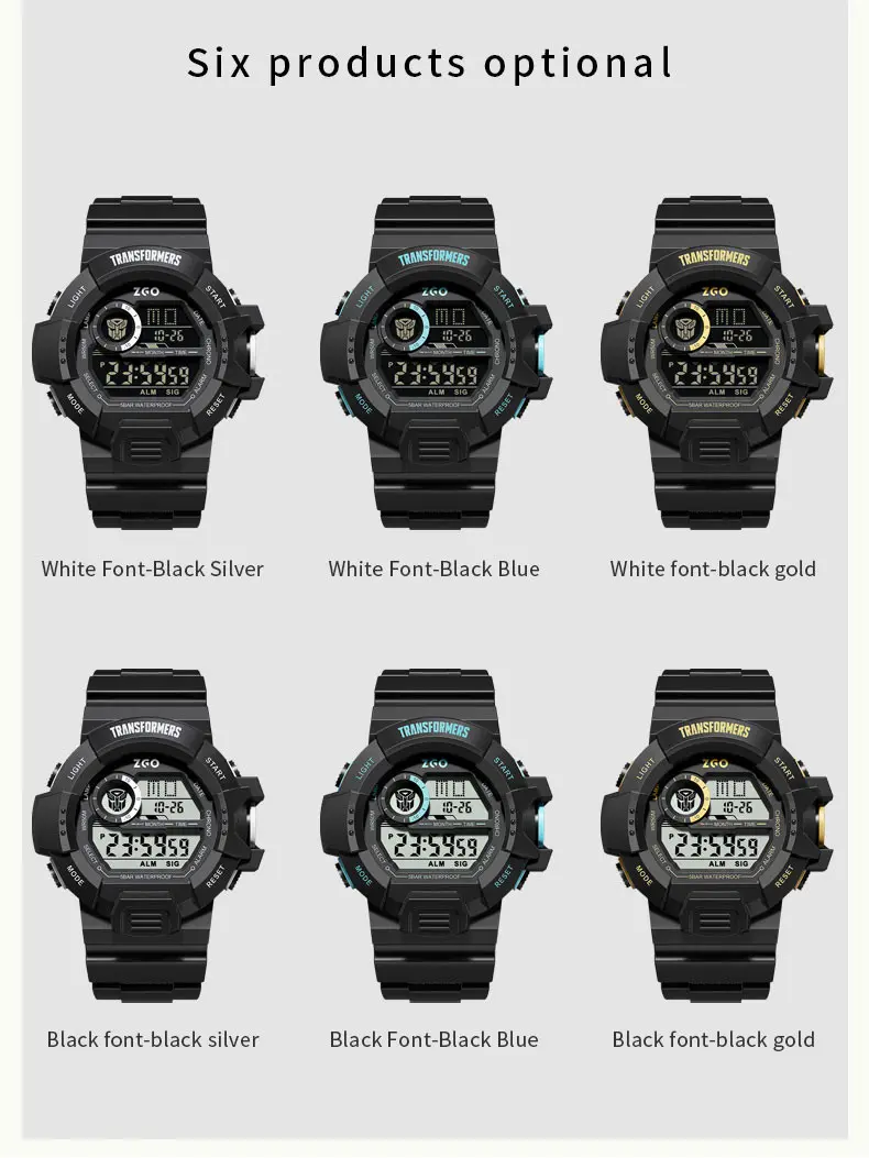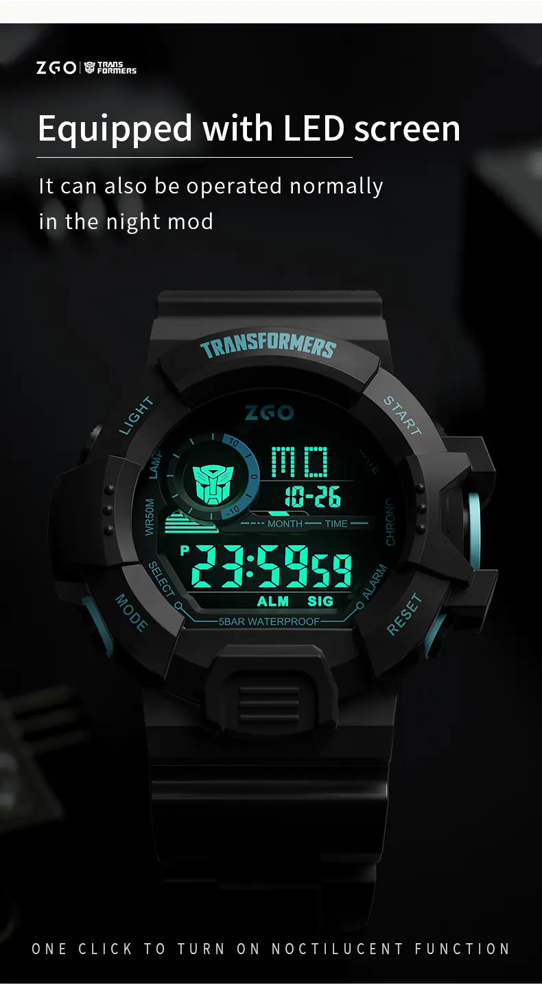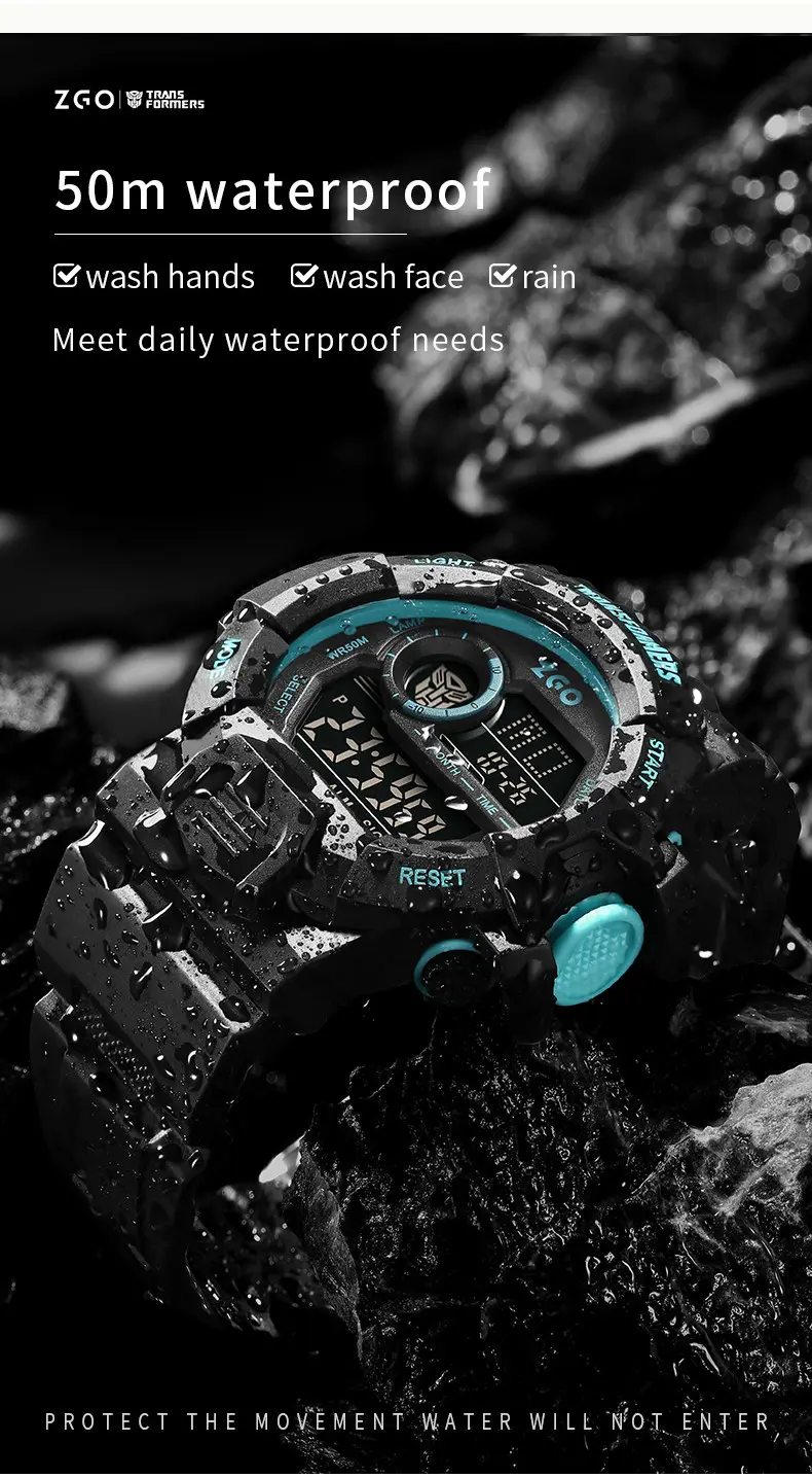 Specifications: Material: Durable rubber strap and organic glass mirror Design and Style: Sporty round shape with large dial for easy reading Waterproof Depth: 5ATM, suitable for swimming and water activities Additional Functions: Luminous alarm clock, 24-hour indication, week and month display Display Mode: Digital with clear LED lights Inclusions: Watch, instructions, and a free Iron box (valued at 1USD) Features: Children's Watches **Durable and Stylish Design** The ZGO X Transformers Children's Watch is a perfect blend of durability and style, designed to withstand the rigors of an active lifestyle. The sporty round shape and large dial make it easy for kids to read the time, while the robust rubber strap ensures a comfortable fit for all-day wear. The watch's organic glass mirror is not only scratch-resistant but also provides a clear view of the digital display, which features a luminous alarm clock and 24-hour indication for precise timekeeping. **Versatile and Functional** This digital wristwatch is not just about style; it's also a practical accessory for children. The 5ATM waterproof depth makes it suitable for swimming and other water-related activities, ensuring that kids can enjoy their favorite sports without worrying about damaging their watch. The watch also includes a week and month display, making it a helpful tool for teaching children about time management and scheduling. With its easy-to-use interface, this watch is perfect for both boys and girls who are always on the go. **A Gift That Keeps Giving** The ZGO X Transformers Children's Watch is an ideal Christmas gift for kids who love both style and functionality. Not only does it come with a watch, instructions, and a free Iron box, but it also serves as a tool for teaching responsibility and time management. The watch's sporty design and waterproof capabilities make it a versatile accessory that can be worn during school, sports, or playtime. With its large dial and easy-to-read digital display, it's a watch that kids will love to wear and parents will love to gift.