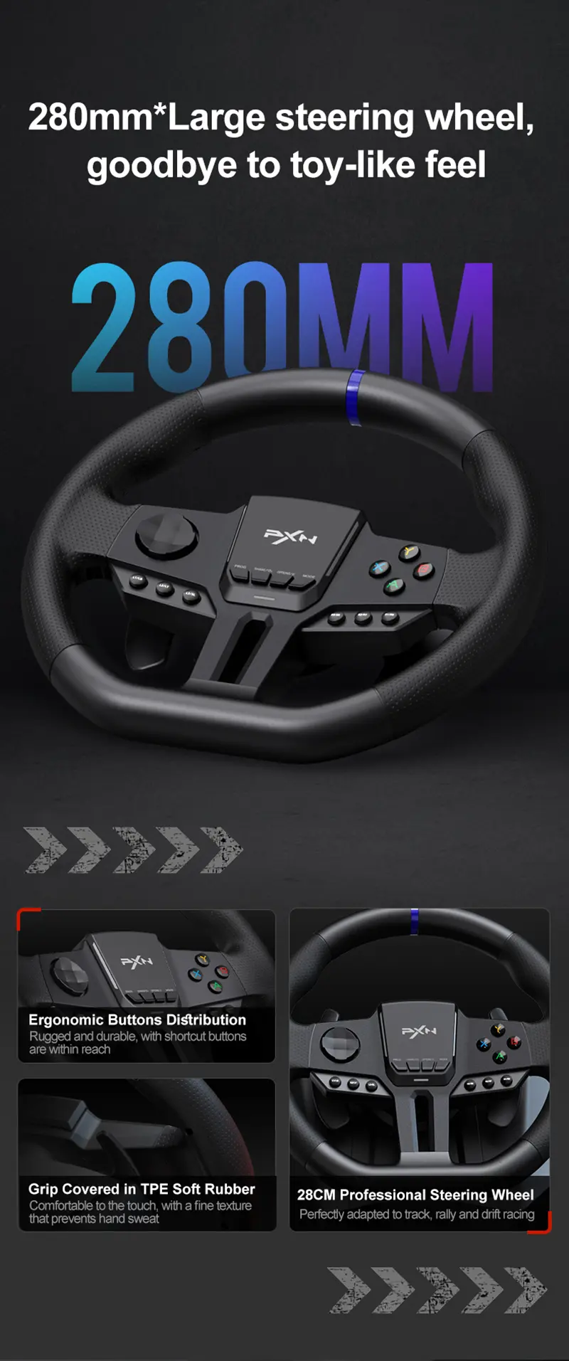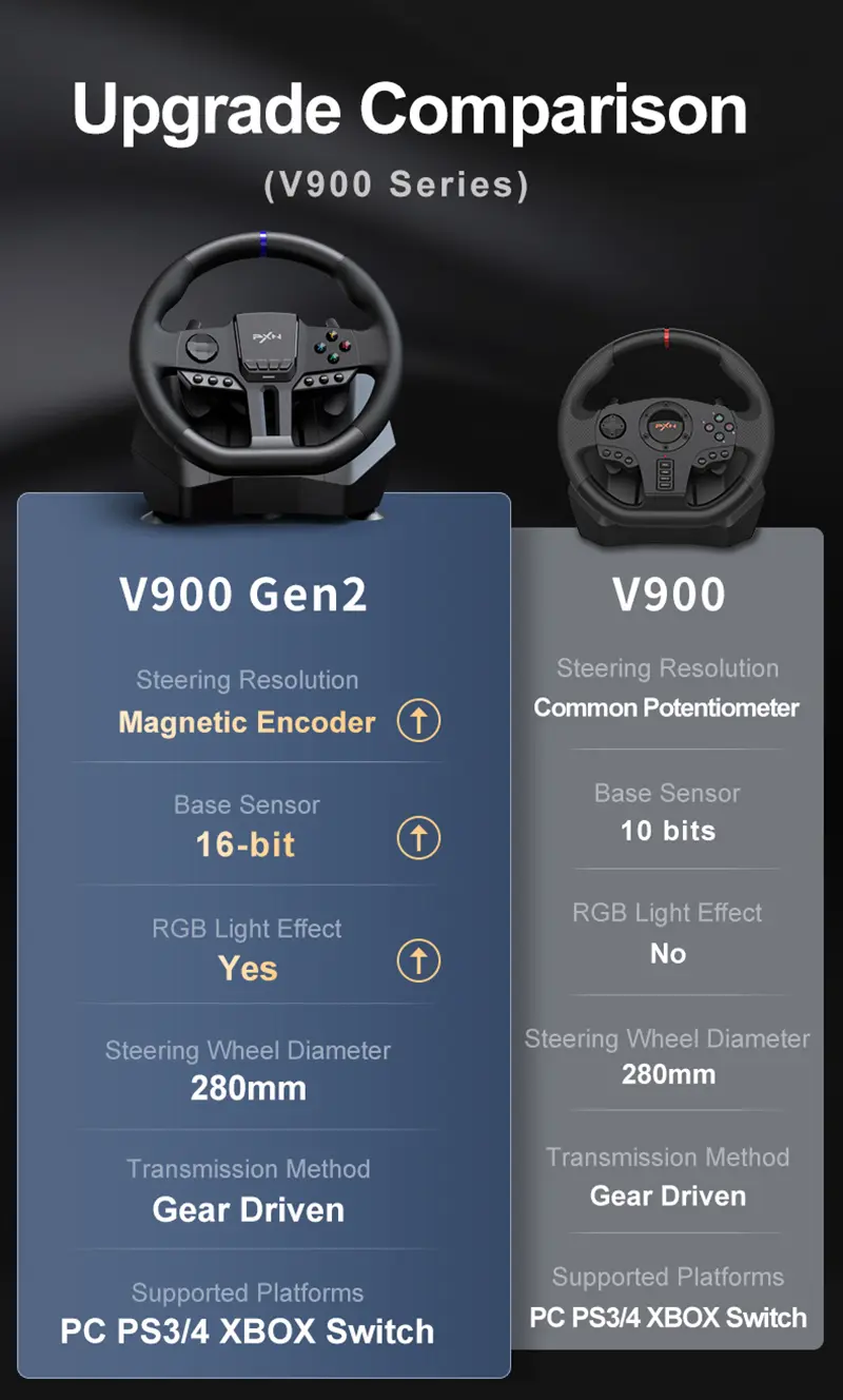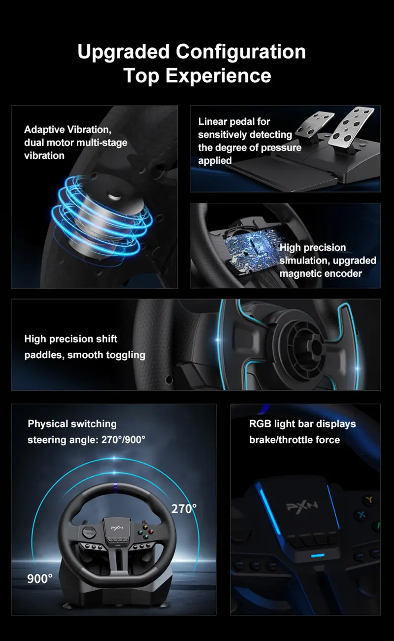 【Strong Sensitivity Racing Wheel】Built-in dual vibration motor racing wheel. With multi-level vibration function, it can automatically adjust the vibration output according to the changes of the game scene, there are 3 adjustable sensitivity levels (low/medium/high, different sensitivity is suitable for different platforms, please refer to the manual for details), buttons on the steering wheel You can program the settings according to your own preferences.