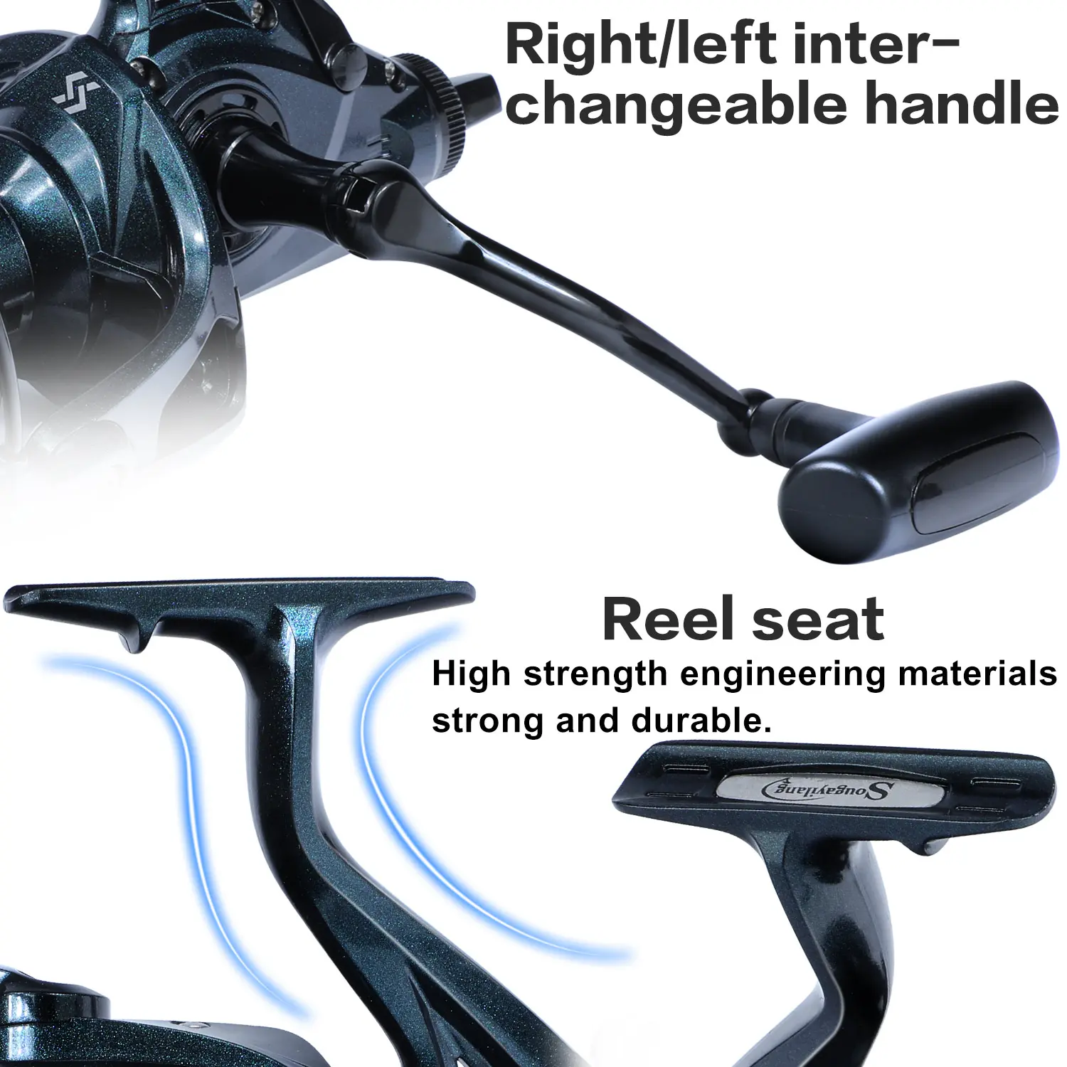 Super Steady Oscillation :sougayilang spinning graphite body enhanced stainless steel shaft, CNC aluminum spool and interchangeable right or left handle, deliver a reliable reel for years of big game fishing. 4.6:1 Gear Ratio is designed for fighting against monster catching, enable confidence to land the biggest saltwater fish out there.