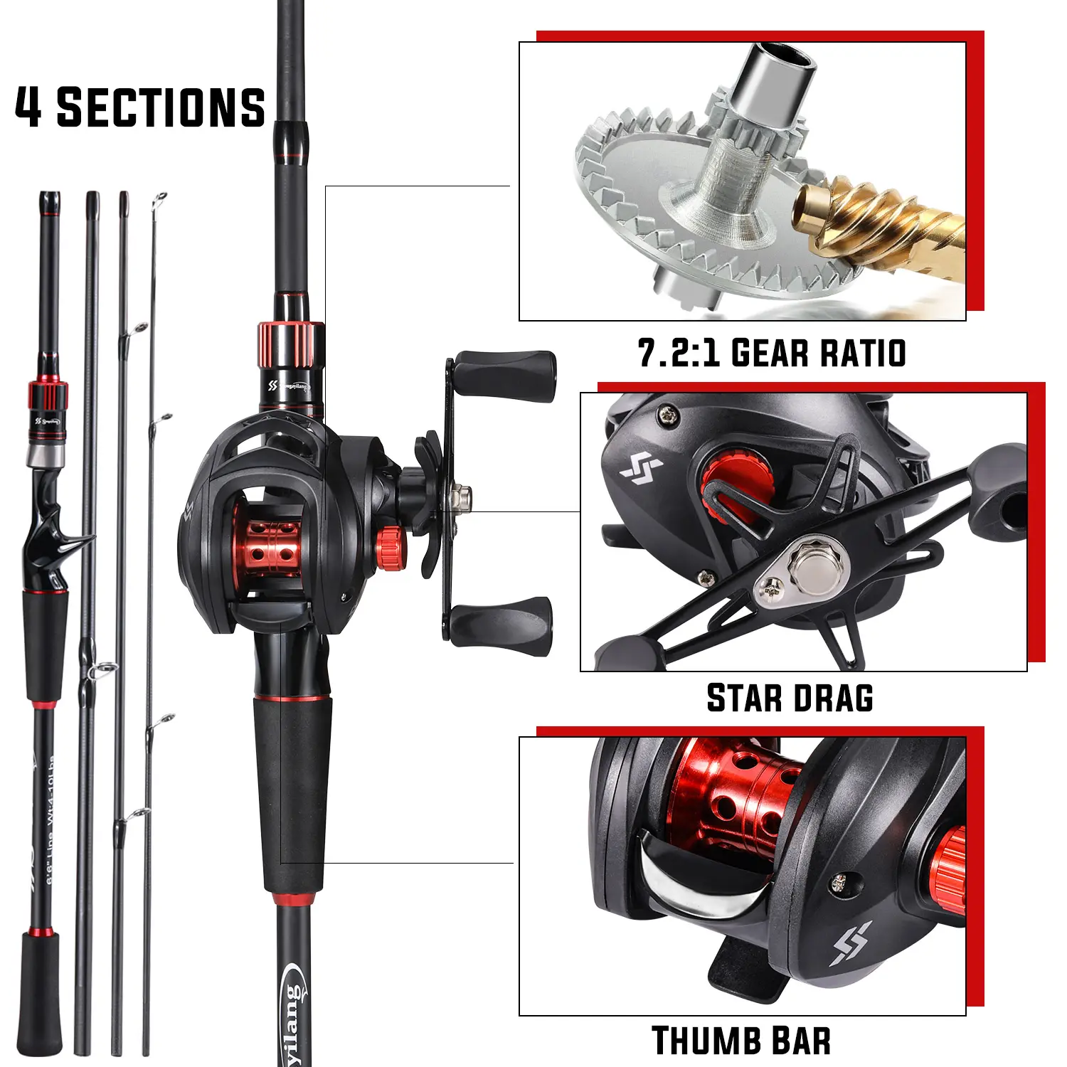 Sougayilang Fishing Rod Reel Combo 1.8~2.1m Carbon Fiber Casting Rod and 7.2:1 Gear Ratio Baitcasting Ree Max Drag 10kg for Bass